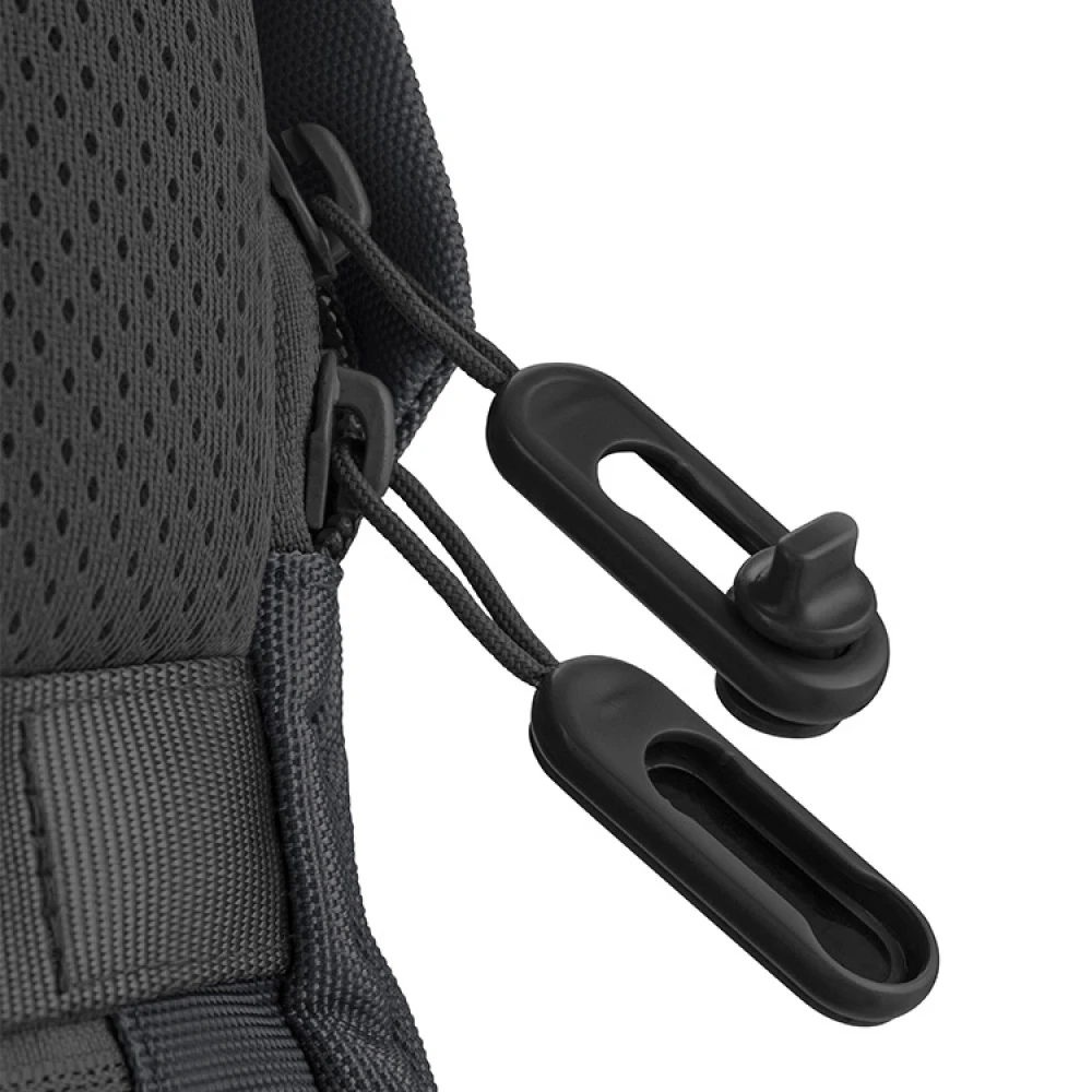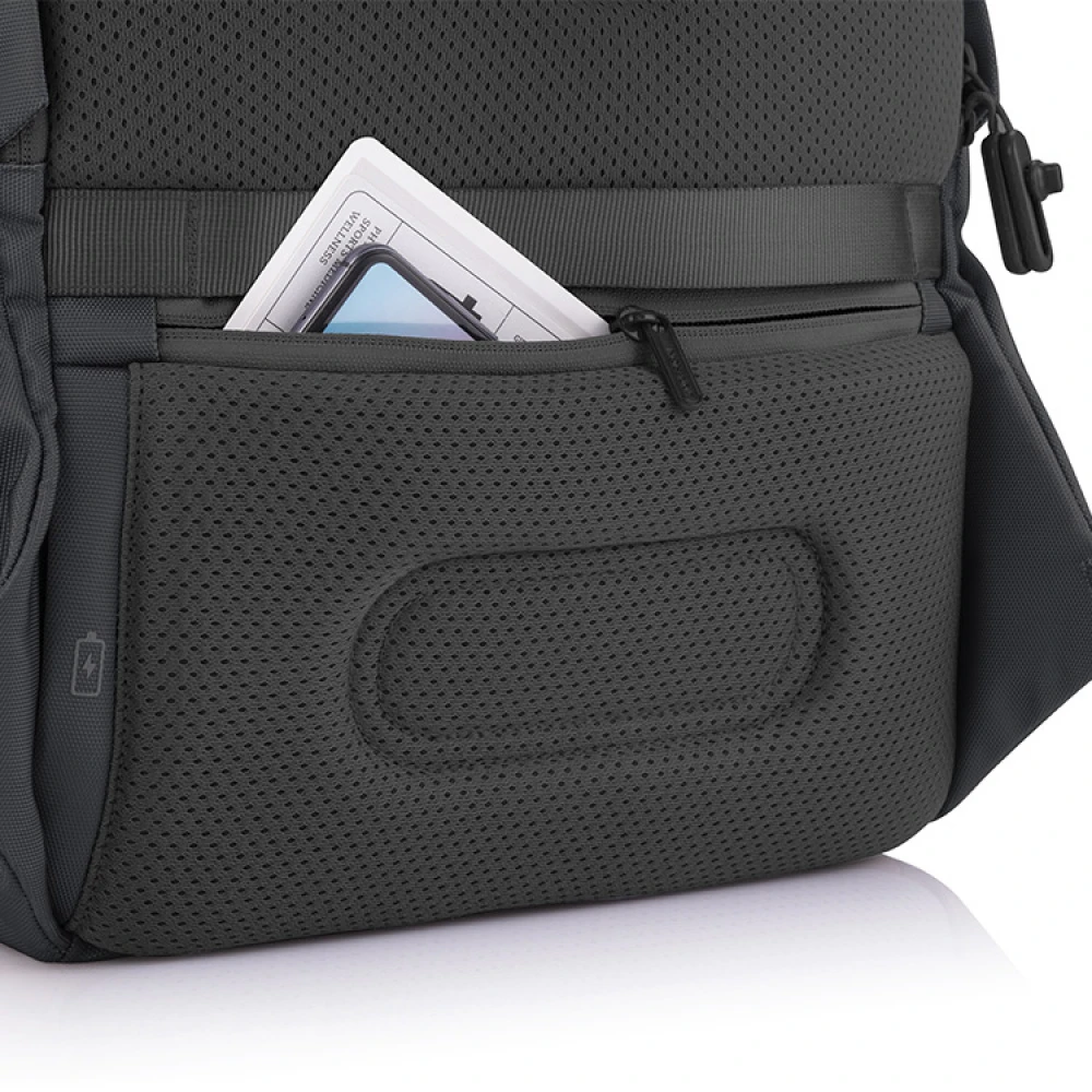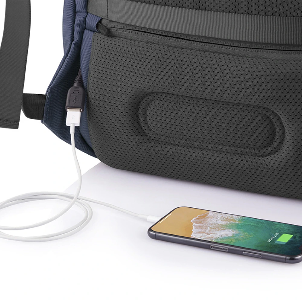 If you own a Powerbank, you can use the integrated USB port. Place the Powerbank in the rucksack and connect it to the socket inside the rucksack. Then connect your mobile phone’s charging cable to the USB socket on the outside. You can now charge your phone with the Powerbank safely inside the rucksack. NB! Powerbank not included.