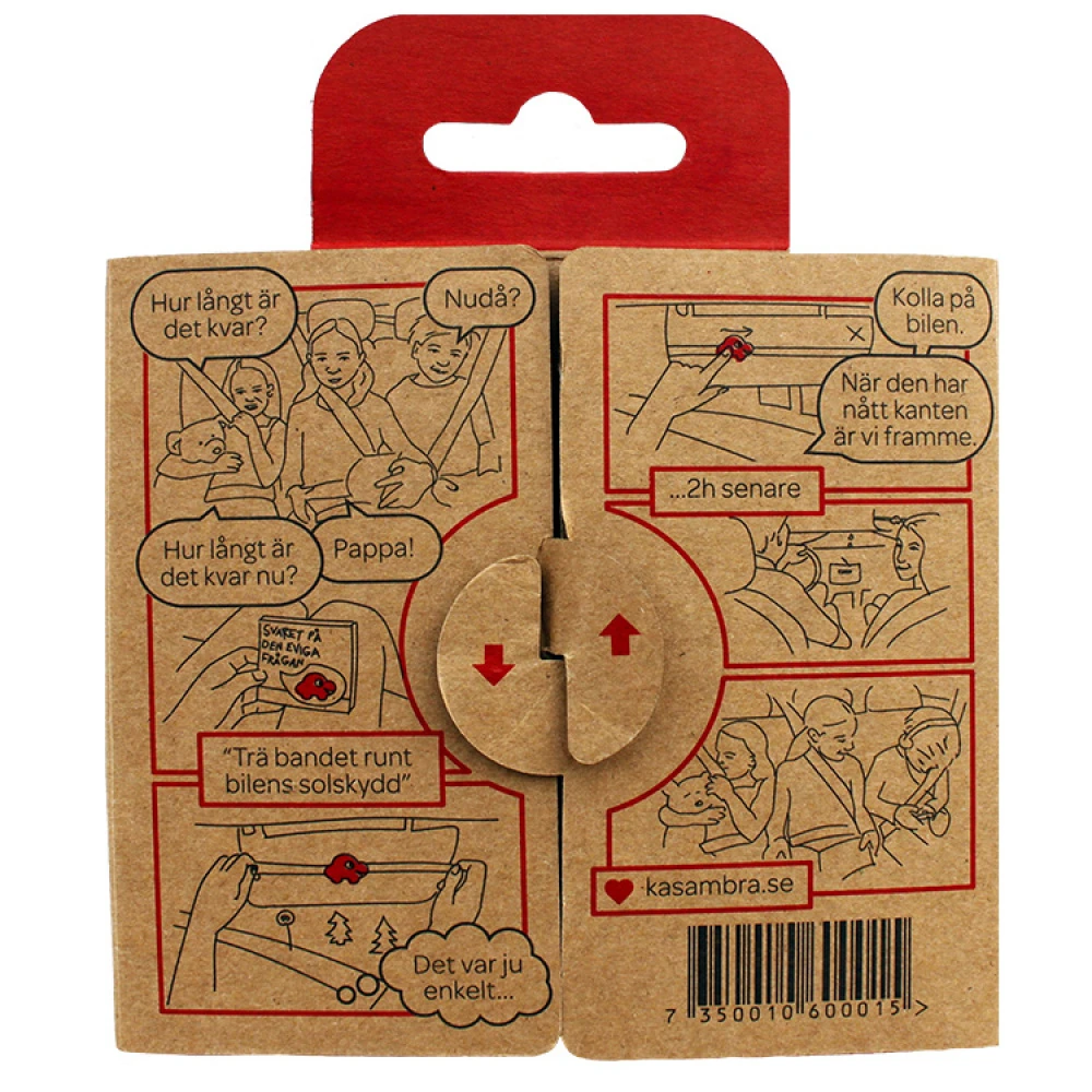 Attach the route pointer to the sun visor with the elastic band. When the child asks if they are there yet the parent moves the small red car along the band to show how much longer they will be travelling