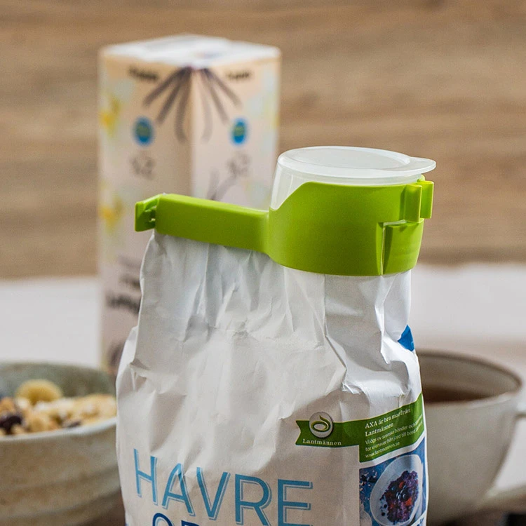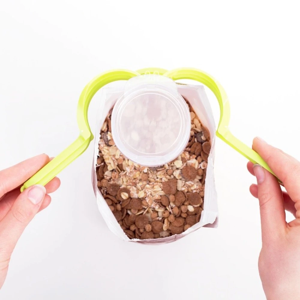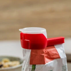 Recognize this clever little clip? Now it’s all grown up! Not only does it keep your food fresh, it makes it easy to pour out the contents of the bag!