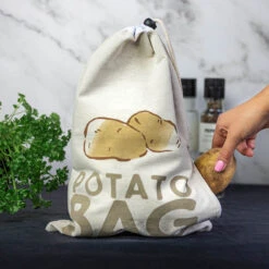 The bag can hold up to 2.5 kg of potatoes or onions and can be hung up by its drawstring. There is a zip in the bottom corner so you can remove the potatoes you need without taking the bag down from the wall.