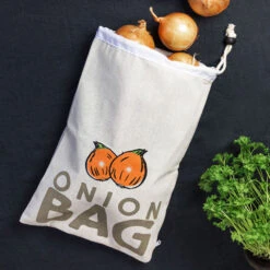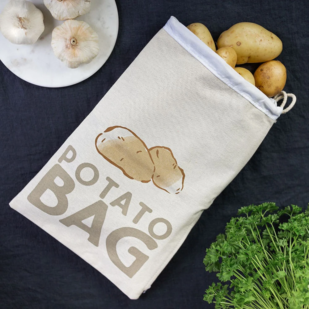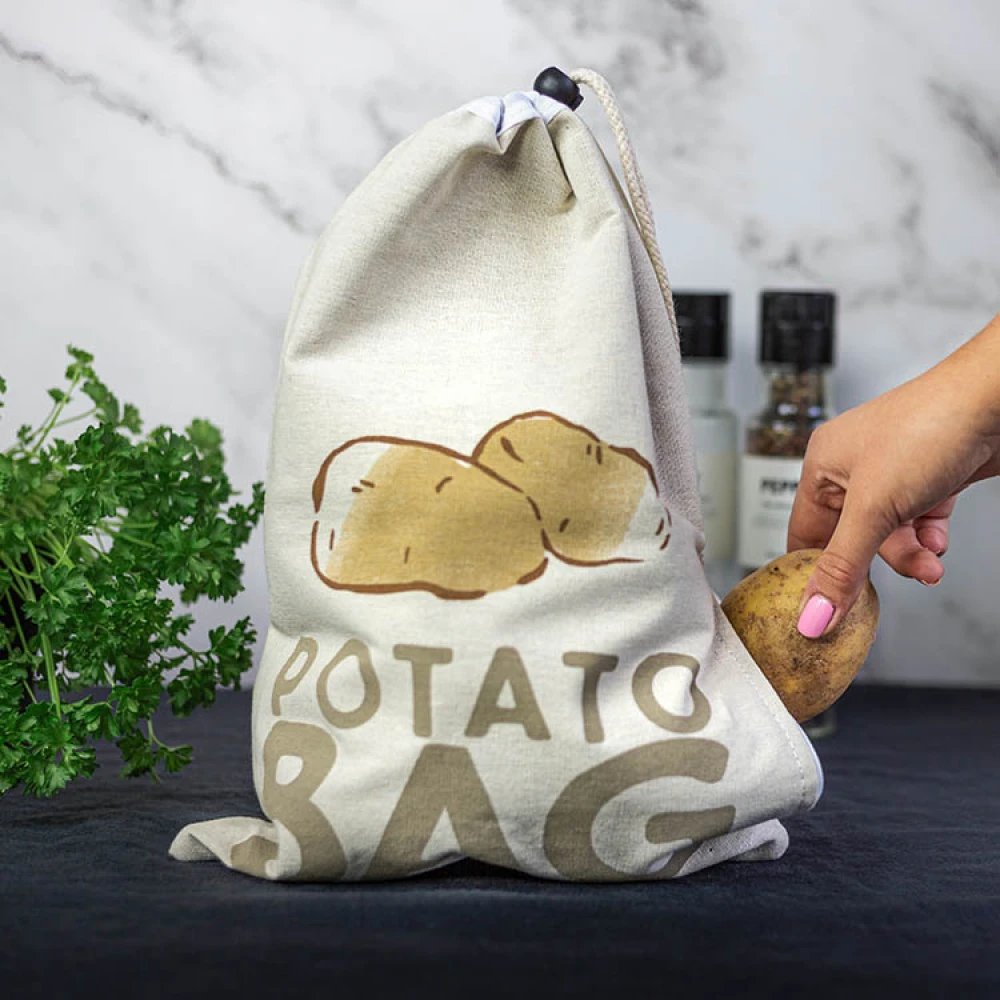 Practical storage bag for potatoes, onions, garlic and other producethat can be stored at room temperature instead of taking up room in the fridge. The material is breathable and allows air to circulate so your produce stays fresh for longer. The dark inside discourages sprouting.