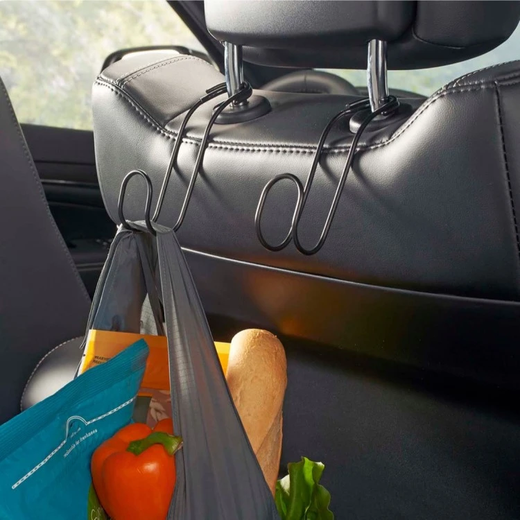To hang up the bag hooks pull the metal wires apart and fasten the hooks to the headrest. The bag hooks can hang forwards or backwards and are perfect for hanging on the front seat headrest.