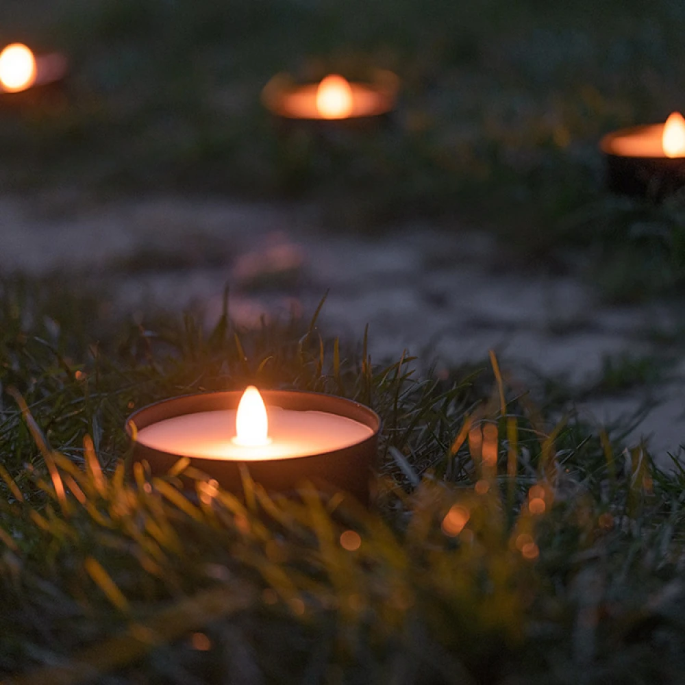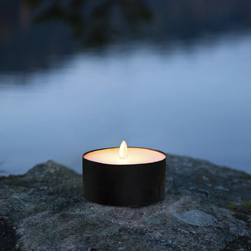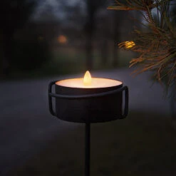 The battery-powered garden candle is made of black sheet metal and wax. Avoid placing the candle in direct sunlight on hot days, as the wax risks melting from the heat.
