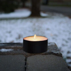The battery-powered candle can withstand being outside, but it should not stand in a pool of water or in a pile of snow. Fold out the small metal feet under the candle and it will be slightly elevated above the ground, the terrace or the candle holder.