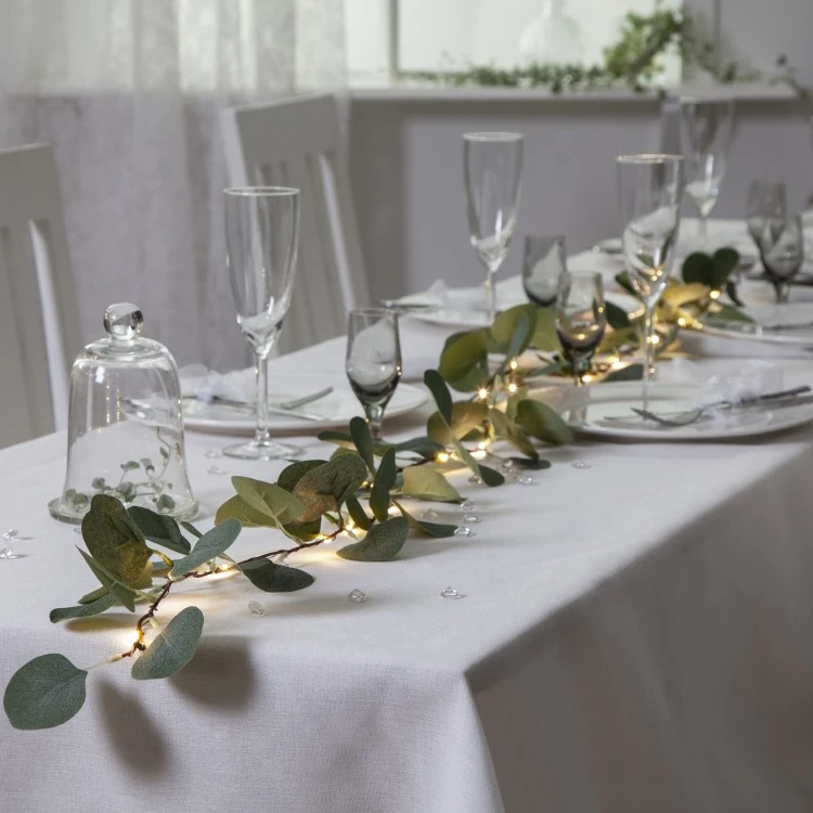 The battery-powered string lights have leaves in the style of eucalyptus that makes the string lights a bit more festive to hang up, wind around the workplace, or decorate your table with. The small LED-diodes are spread out along the whole string and shines with a warm white glow through the leaves when lit.