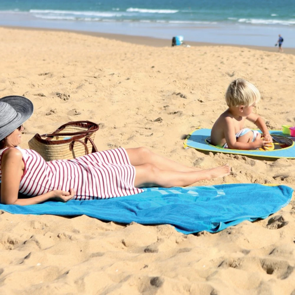 The beach pool allows the child to play on their own while still being under supervision. The pool is easy to unfold and can be placed right next to where you sit on the beach.