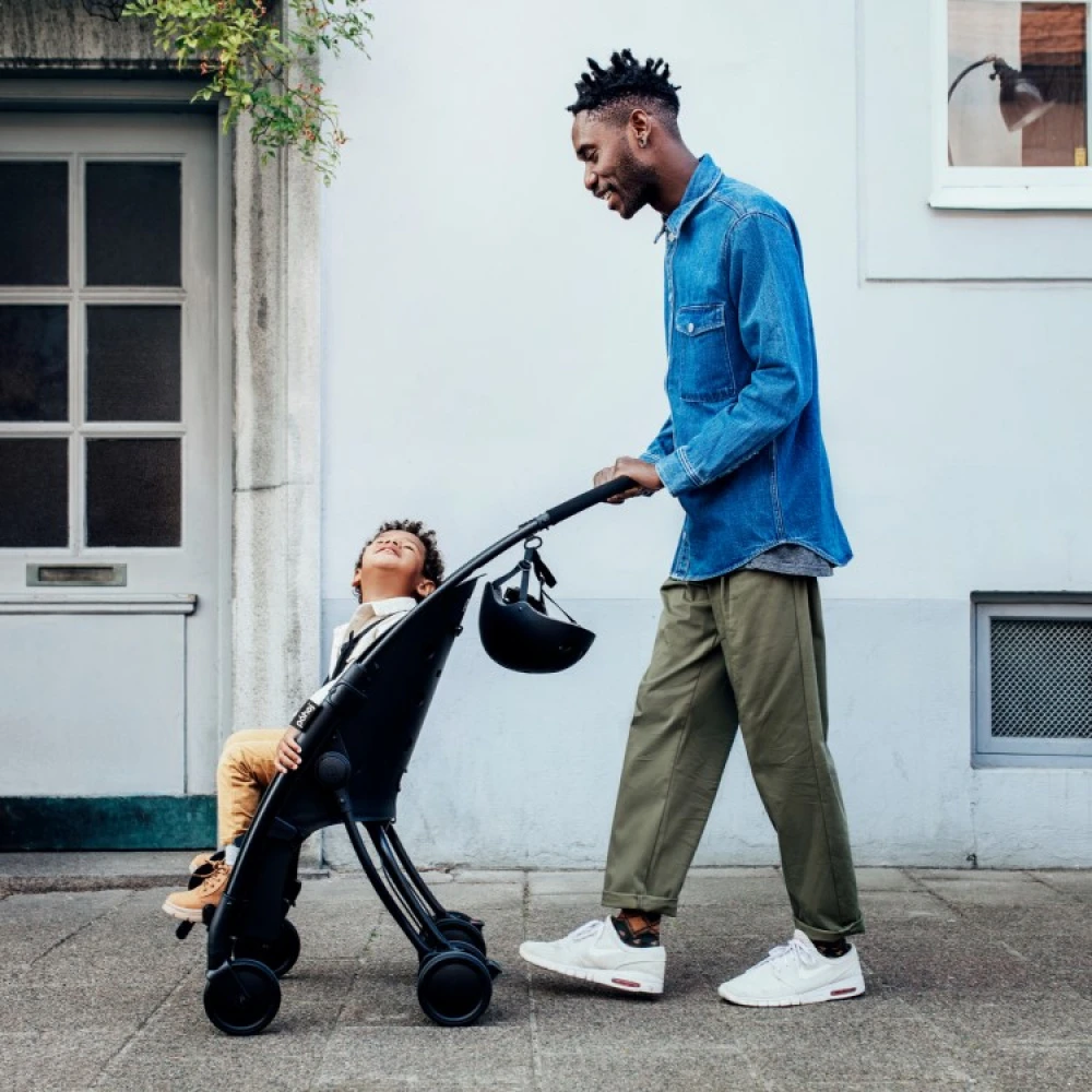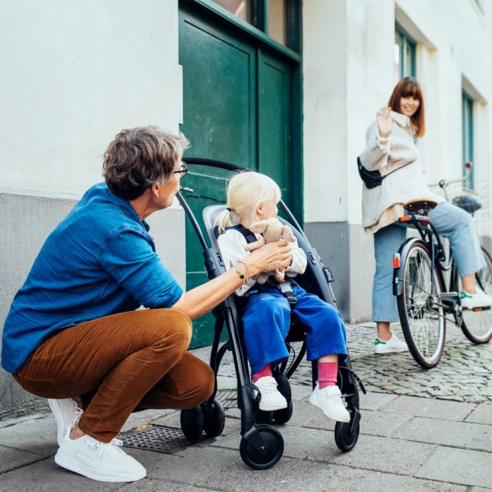 It’s very easy to turn your bike seat into a pushchair. Lift your child out of the bike seat, unfold the rear wheels and click the seat off the bike ā your child now has a pushchair to sit in!
