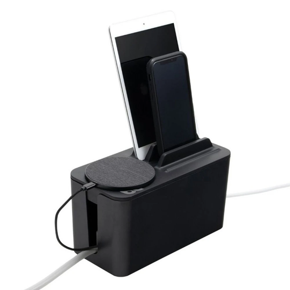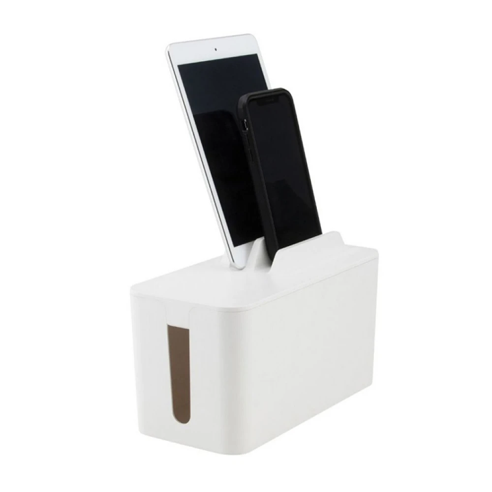 The cable box can hold a short extension lead of no more than 22.5 cm long. The charging stands on the top fit most tablets and mobile phones.