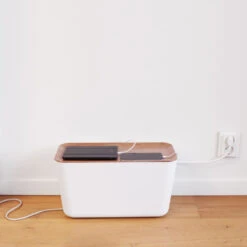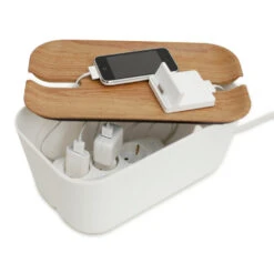 The cable-management box is a great spot to keep the entire family’s chargers. Place mobile phones, cameras and other electronics on the lid to be charged, reducing a great amount of clutter, with the cables stored underneath.