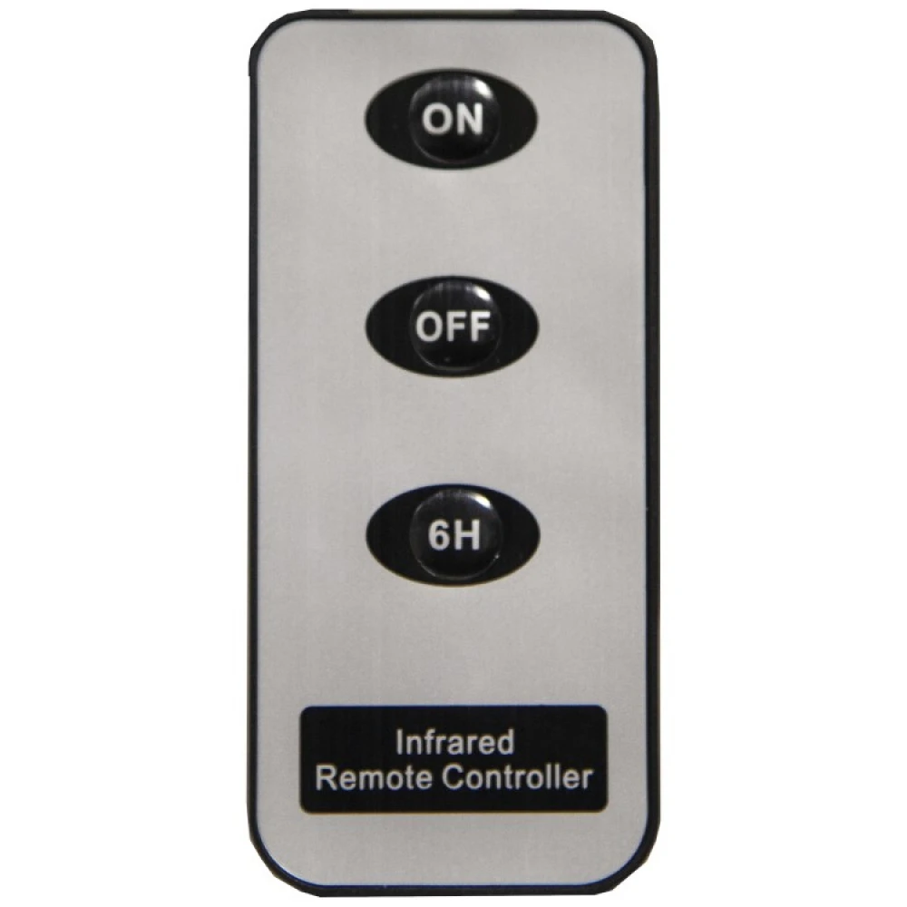 The remote control has an On button, an Off button and a Timer button marked “6h”. Pressing the timer button starts a timer that keeps the lights on for 6 hours. After that, the lights turn themselves off and stay off for 18 hours. The lights will automatically come back on at the same time the next day.