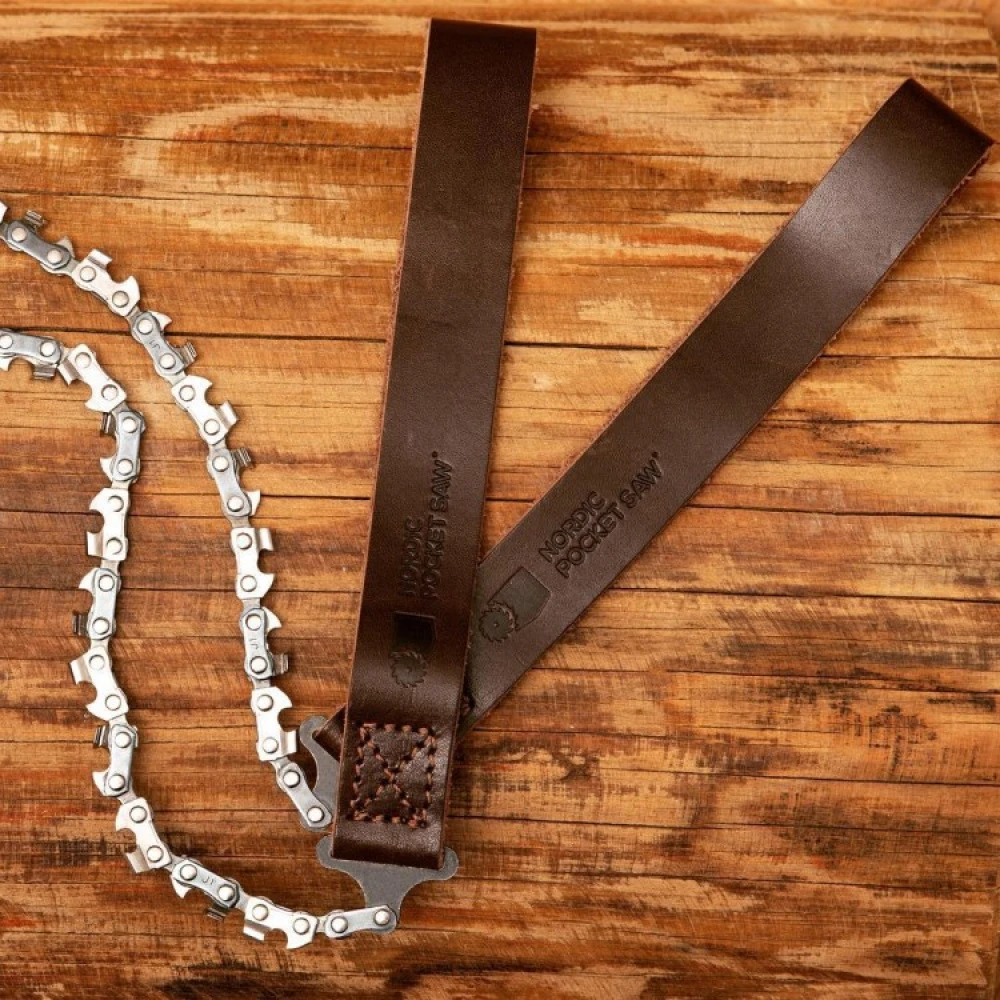 The Nordic Pocket Saw Premium Edition is a really sharp and strong chainsaw that is perfect for trips and outdoor adventures in the forest. The chainsaw’s high-quality leather handle creates a comfortable grip in all weathers and the heat-treated high carbon chain can handle a range of situations.