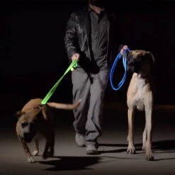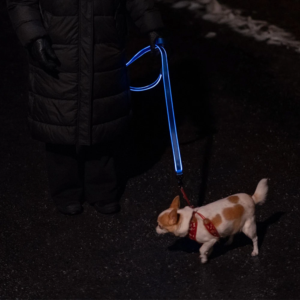 With the button on the small pad by the handle, you choose whether you want the leash to flash, shine with a steady light or be switched off. The LEDs at each end of the leash transmit the light via fiber optic cables so that the sides of the entire leash light up in the dark.