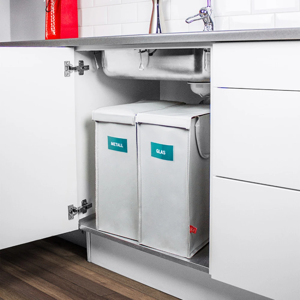 Exchangeable signs are included with the bags and can be placed in the transparent pocket on the front. The signs tell you where to sort your glass, metal, plastic and paper. You can also create your own signs and choose exactly what should be put in each bag.