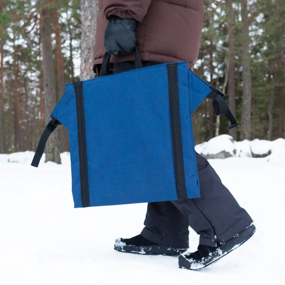 The backrest is very easy to use. You unfold the backrest, sit on the seat pad and then adjust the angle of the backrest with the straps until you’re sitting comfortably. The navy blue 600D polyester fabric protects your bottom from damp and cold surfaces and the backrest is held in place by your own weight.