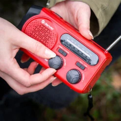 With this portable crank radio, you can stay up to date even when there’s a prolonged power outage. It has an FM/AM radio and can be charged in three different ways: by dynamo crank, solar cells and USB cable.