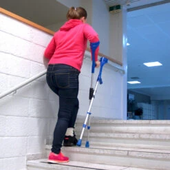 When you attach the crutches you can still use one of them to support yourself with it. The loose crutch can be turned around so it doesn’t get in your way when walking in stairs or escalators.