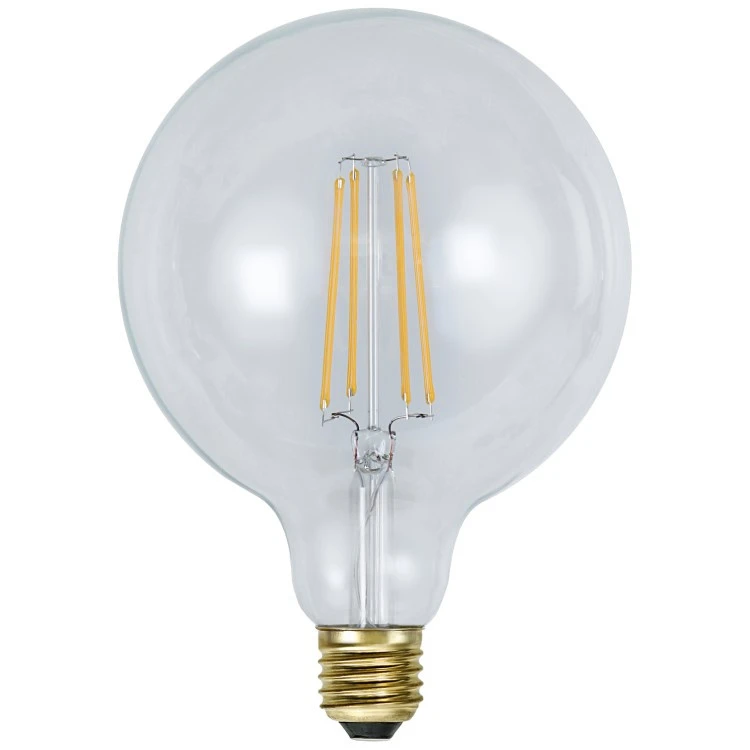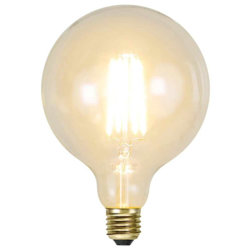 Clear, dimmer-compatible LED lamp with warm white light that fits many different types of cords, table lamps and floor lamps with dimmable light. The globe-shaped LED lamp fits in lamps with an E27 (wide) base.