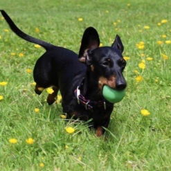 The activity ball’s irregular shape makes it bounce unpredictably, which presents a challenge and makes it more fun for your dog to try and catch it. The ball has a mild vanilla fragrance and can also be filled with treats to give your dog an extra reward while playing.