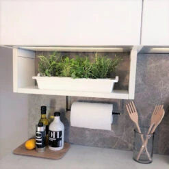 DSHELF has a patented mounting solution and is designed to be easily mounted. Create more space in the kitchen by hanging the shelf under your kitchen cabinets or by placing it on your island. Cookbooks, spices and other kitchen appliances will be kept organised, giving you a neat environment to work in.