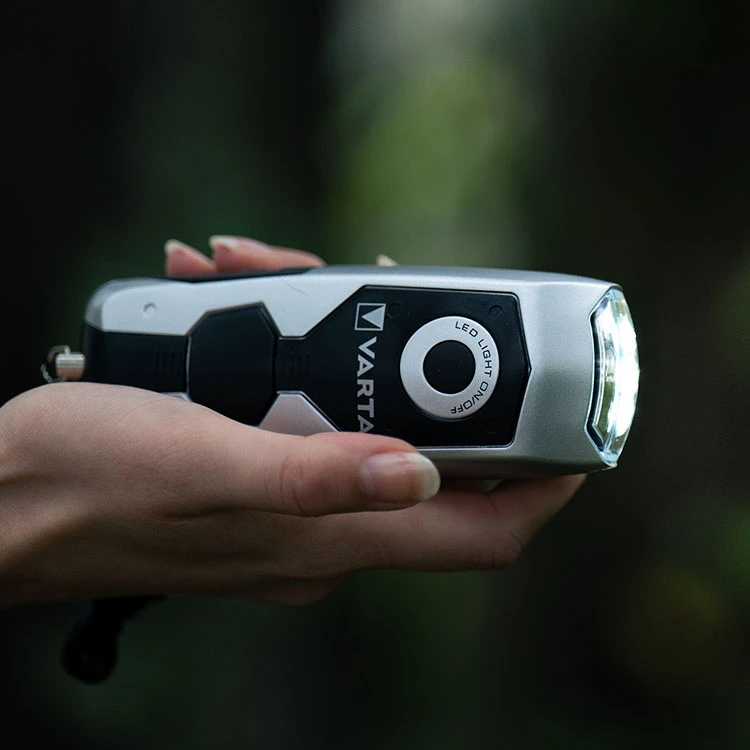 The built-in dynamo charges your flash-light in just a few turns. 1 minute of rotating gives you approximately 30 minutes battery life! A fully charged battery will last you a total of 1.5 hours.