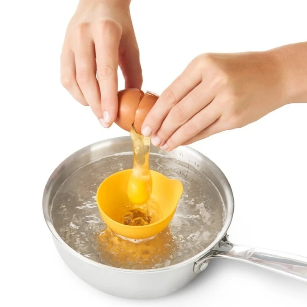 The egg poacher is placed in the bottom of the saucepan and the smart water markings show you how much water you’ll need to boil. When the water has boiled, crack an egg into the egg poacher. The smart funnel helps the egg into the water and prevents the yolk from breaking.