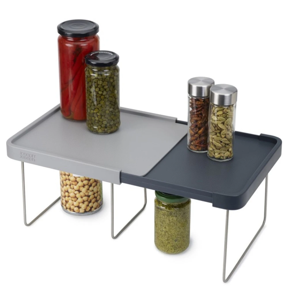 Joseph Joseph’s extendable shelves allow you to make efficient use of the entire height of your cabinets and drawers. The extendable shelf can be adapted to both space and needs and gives you space to stack your things both on top and under the shelf.