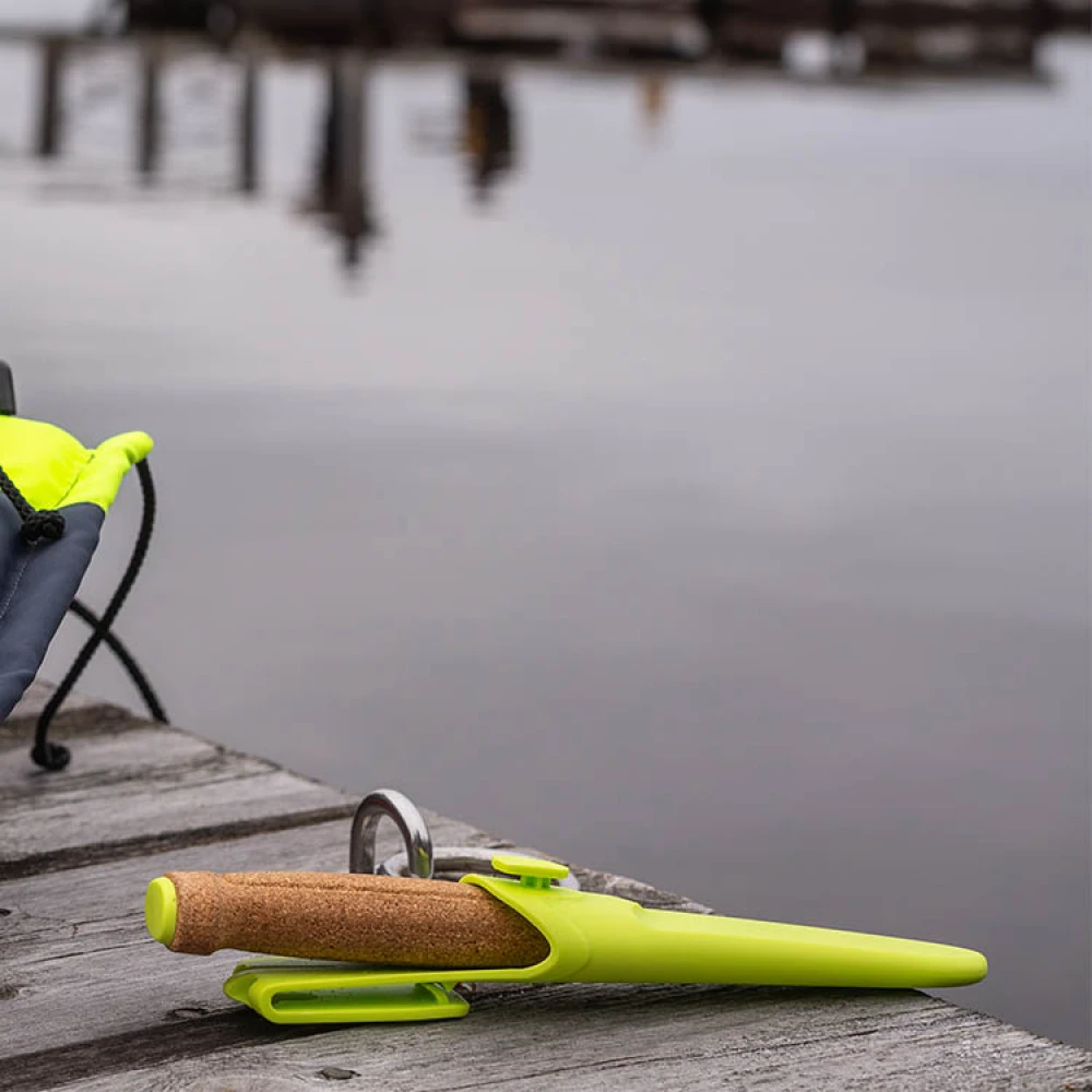 The lime green sheath is made from a Hi-Vis polymer that makes it easy to spot if it ends up in the sea. The sheath has a belt clip on the backside that allows you attach the knife to a belt or your life vest. It can also be attached to the tool knobs on overalls and similar kinds of clothes.