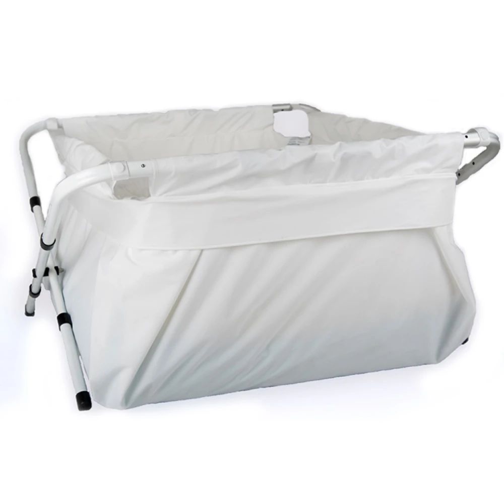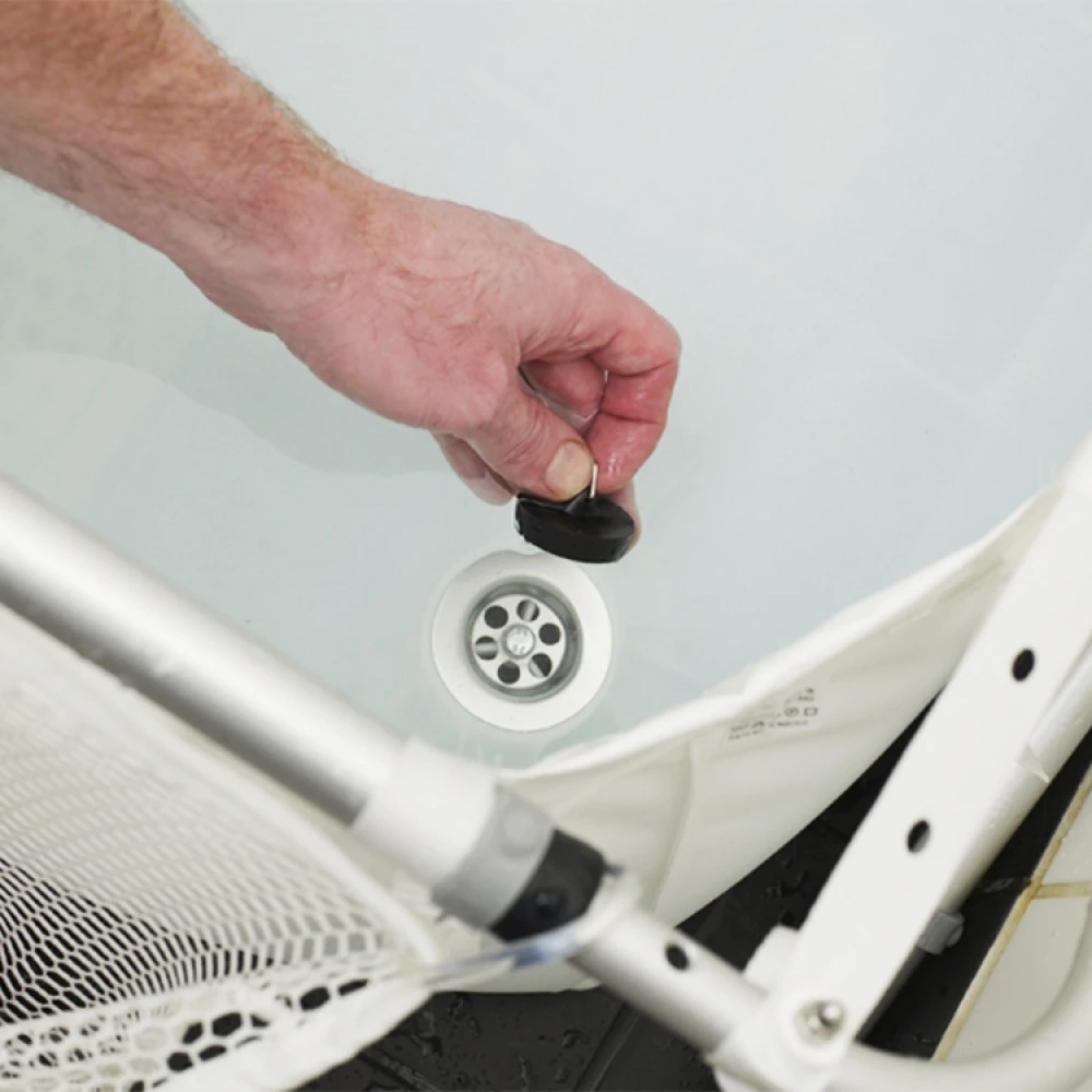 BibaBad consists of a lightweight, rust-free and adjustable aluminium frame, adjustable straps, the bathtub fabric and a bath plug. The bath plug should be positioned over the shower space’s drain and although all bathrooms look different, a hole with a diameter of up to 3 cm should be cut into the bathtub fabric, into which the bathplug should be fitted.