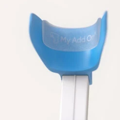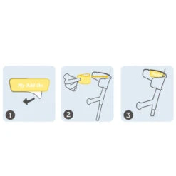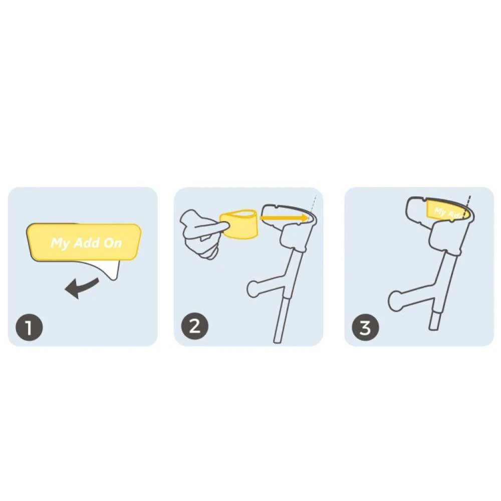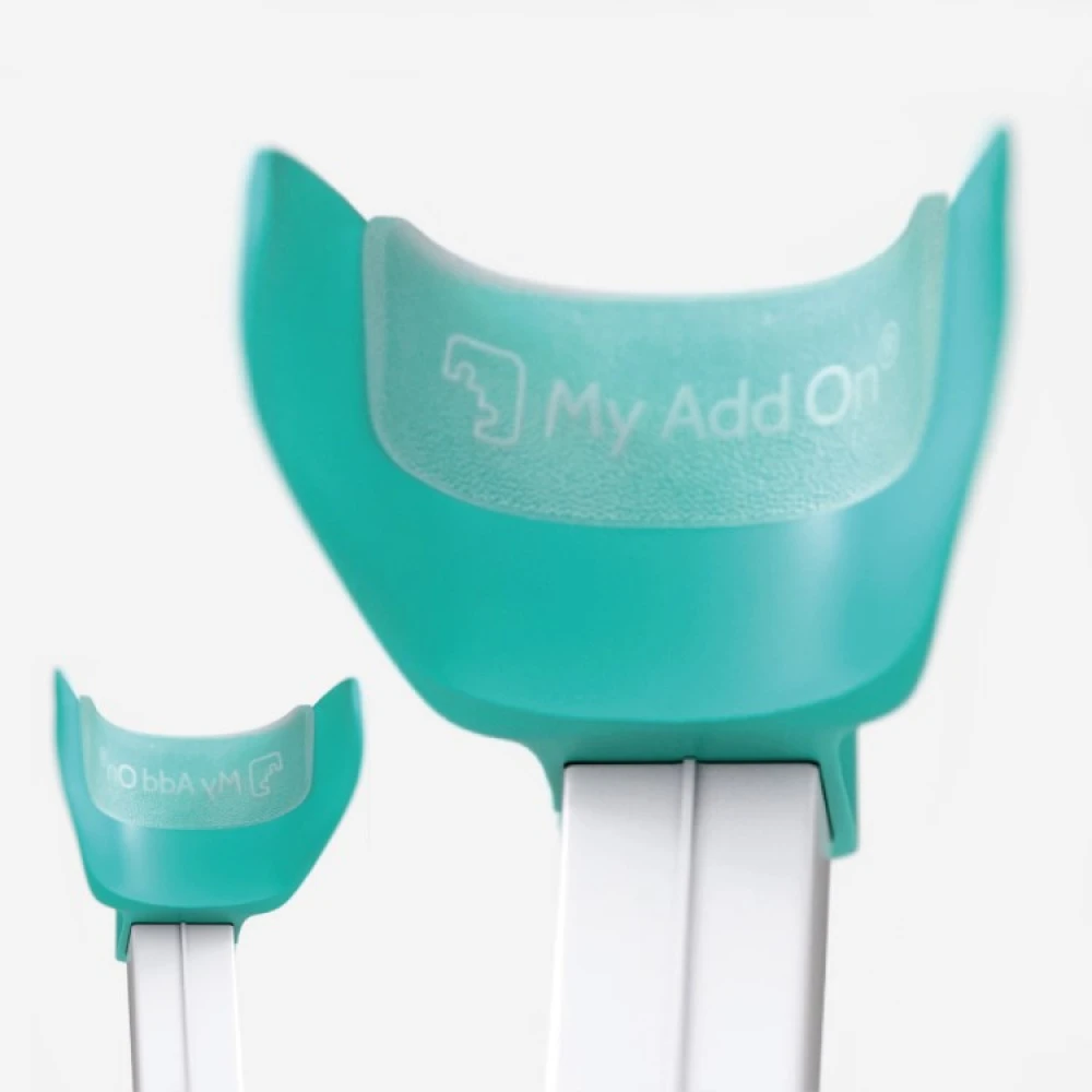 Clean and wipe the inside of the crutches’ armrests from dirt, grease and dust. Then peel off the protective plastic from the sticky side and hold the gel support between your thumb and forefinger. Position the gel support straight and in the middle of the upper edge of the armrest and stick it with the widest side facing up. Finally, fold out the sides and press the gel support firmly into place so that you can read the MyAddOn text.