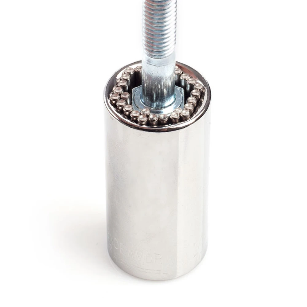 The Gator Grip is a new type of sleeve that replaces multiple socket wrenches in your toolbox. Each socket contains 54 spring-based pins made of high quality hardened steel. When the socket latches onto something, the centre pins retract, allowing the outer pints to firmly surround anything that isn’t perfectly circular.