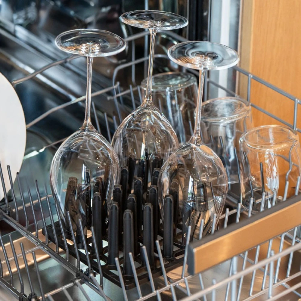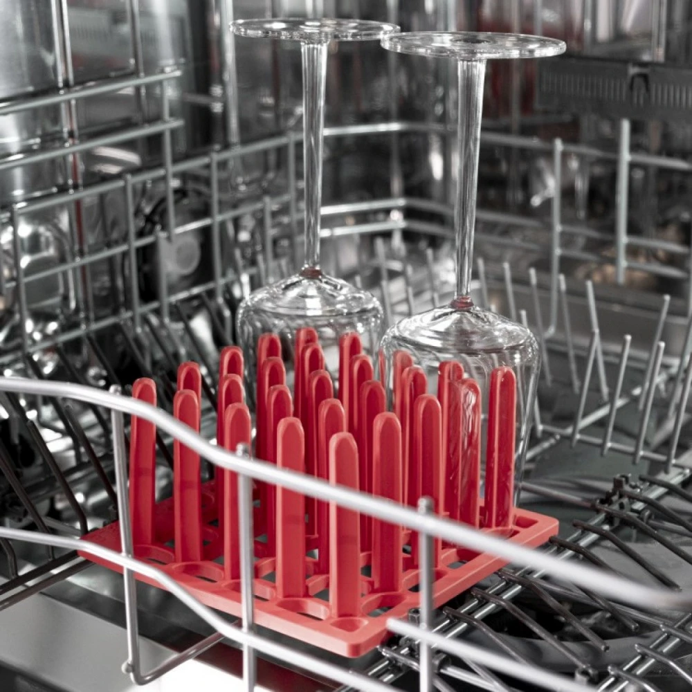 The glass holder is placed on the bottom shelf of the dishwasher and has 25 protruding sticks. The soft sticks give you plenty of space to wash multiple champagne glasses, wine glasses and other tall glasses, while they ensure that your glasses stand firmly in the dishwasher.