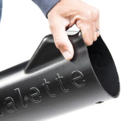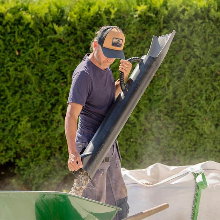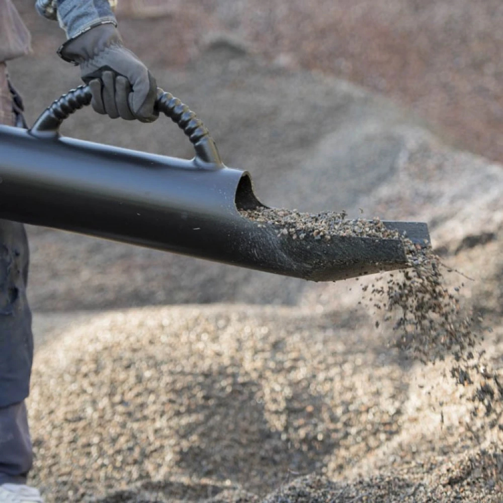 The Skyfflalette is an award-winning shovel that allows you to shovel gravel, sand and other granular materials in a more ergonomic way. The tubular gravel shovel empties from the back. This reduces back strain and makes it easier to shovel and move material between bags, mounds, wheelbarrows, trailers and flower beds as well as to fill holes.