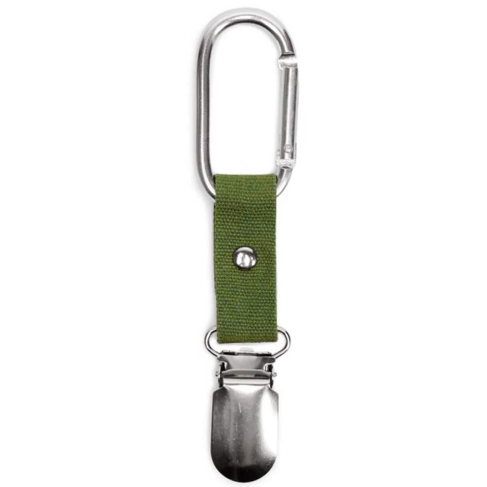The portable hat clip has a small carabiner at one end and a clip at the other. You can attach the carabiner to your bag, pram, rucksack or belt, for example. When you remove your headgear, you can easily attach it to the clip.