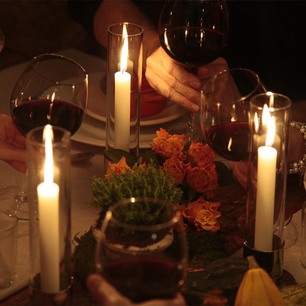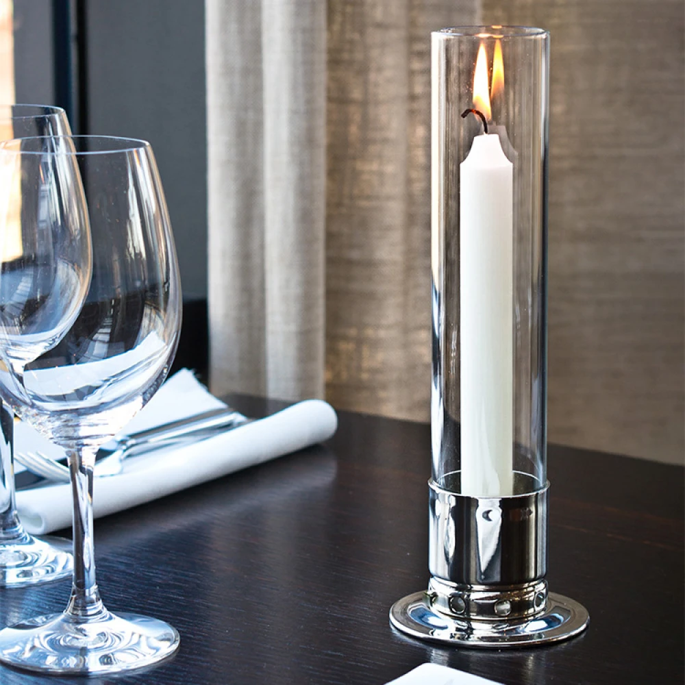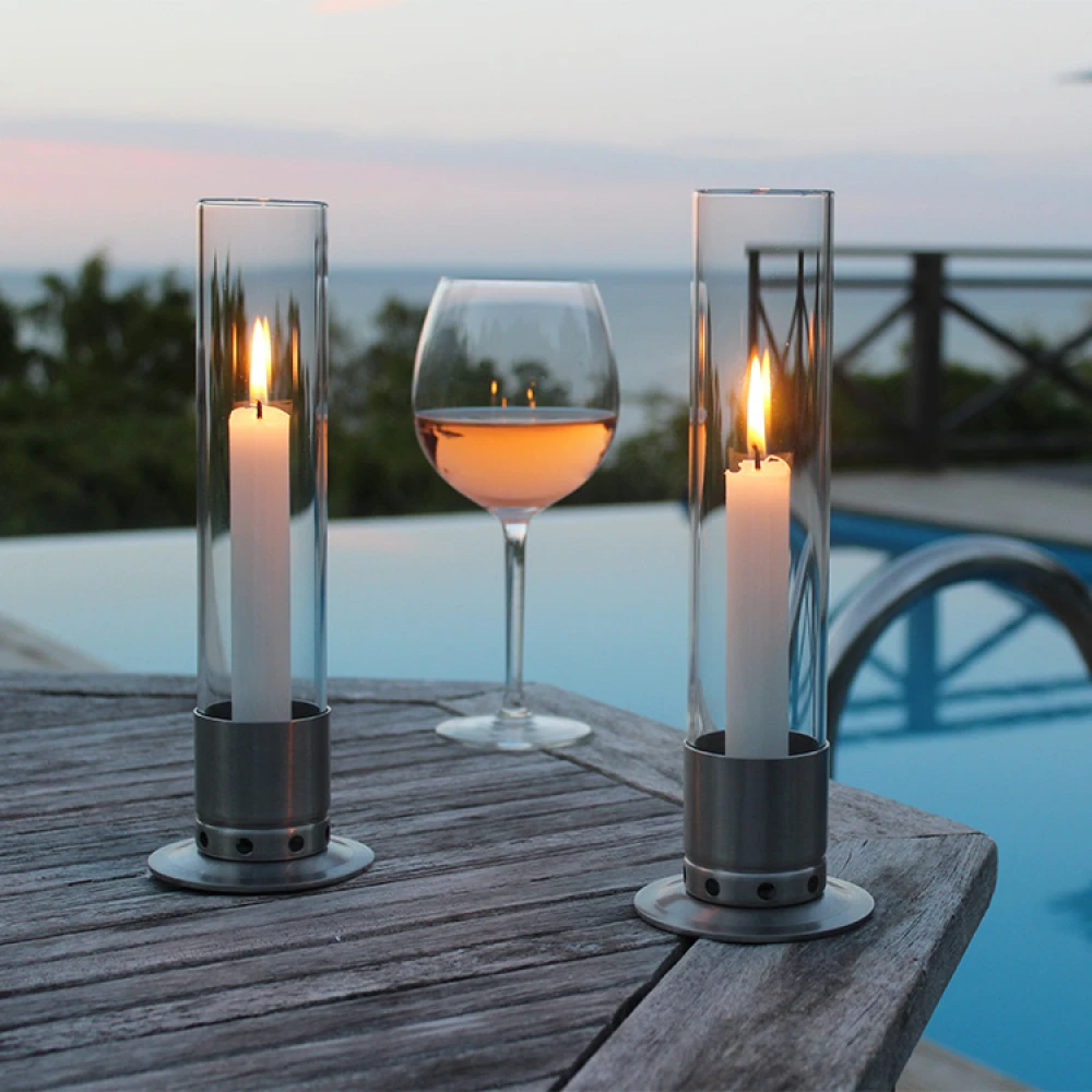 The beautiful glass cylinder surrounds the candle and protects the flame from the wind. The flame is reflected in the glass and creates a cosy atmosphere. The glass also minimises the risk of fire as the flame is protected from its surroundings and any curious pets.