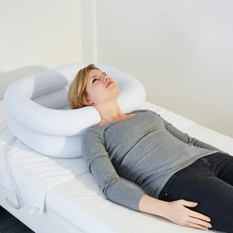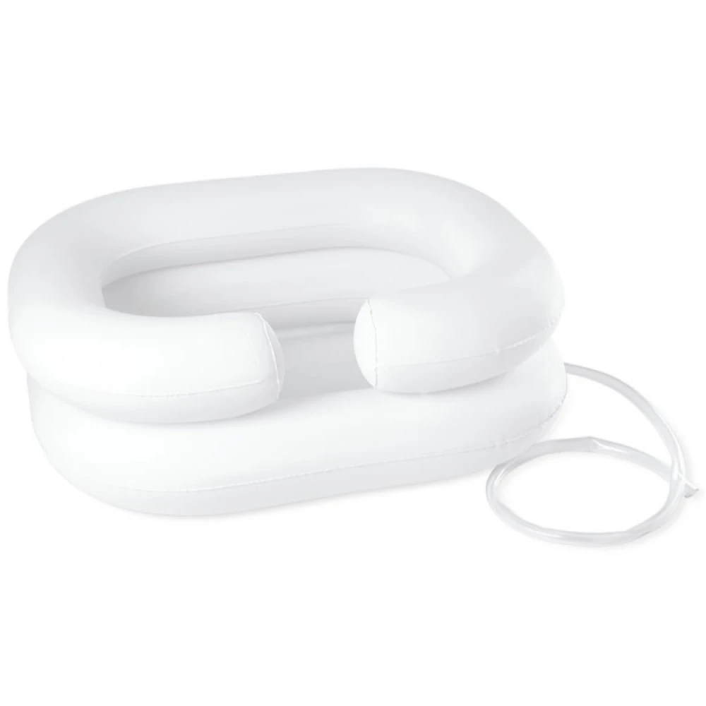 With an inflatable hair wash basin, you can wash the hair of a person lying in bed who would otherwise have difficulty getting to the bathroom to have their hair washed. The inflatable basin provides good support for the neck and the person can comfortably lie down on the bed and have their hair washed.