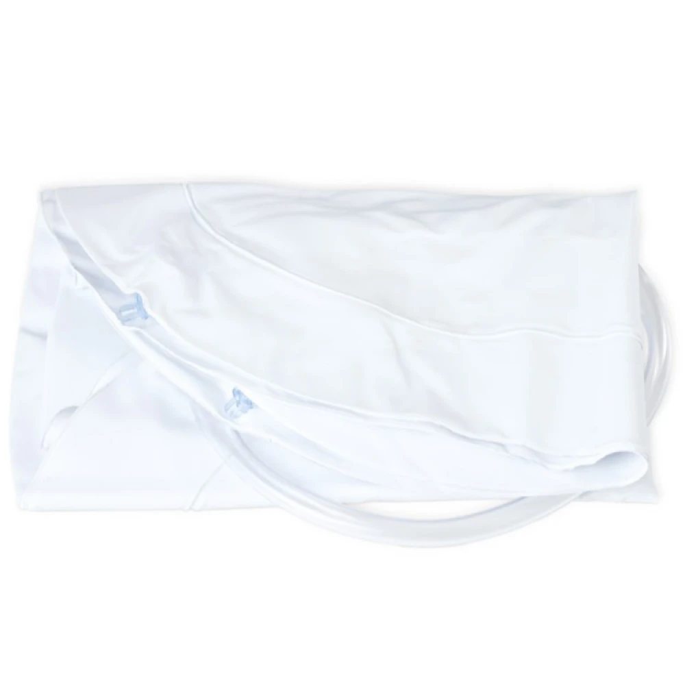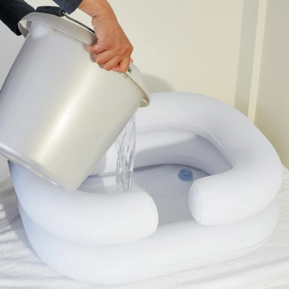 Inflate the hair wash basin with your mouth or use a pump (not included). Make sure to inflate the hair washing basin properly so that the head is well supported. Fill a bucket with water, allow the person to lie down and then pour an appropriate amount of water into the washbasin. Do not overfill the basin with water.