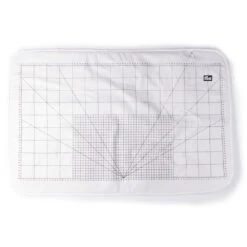 The white side has a printed grid, measurements along two sides and lines at 60°, 30° and 45° angles. The lines, measurements and grid come in handy if you want to iron a straight line, for example if your are ironing a fold on a towel or a pair of suit trousers.
