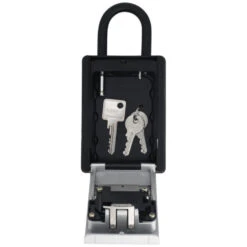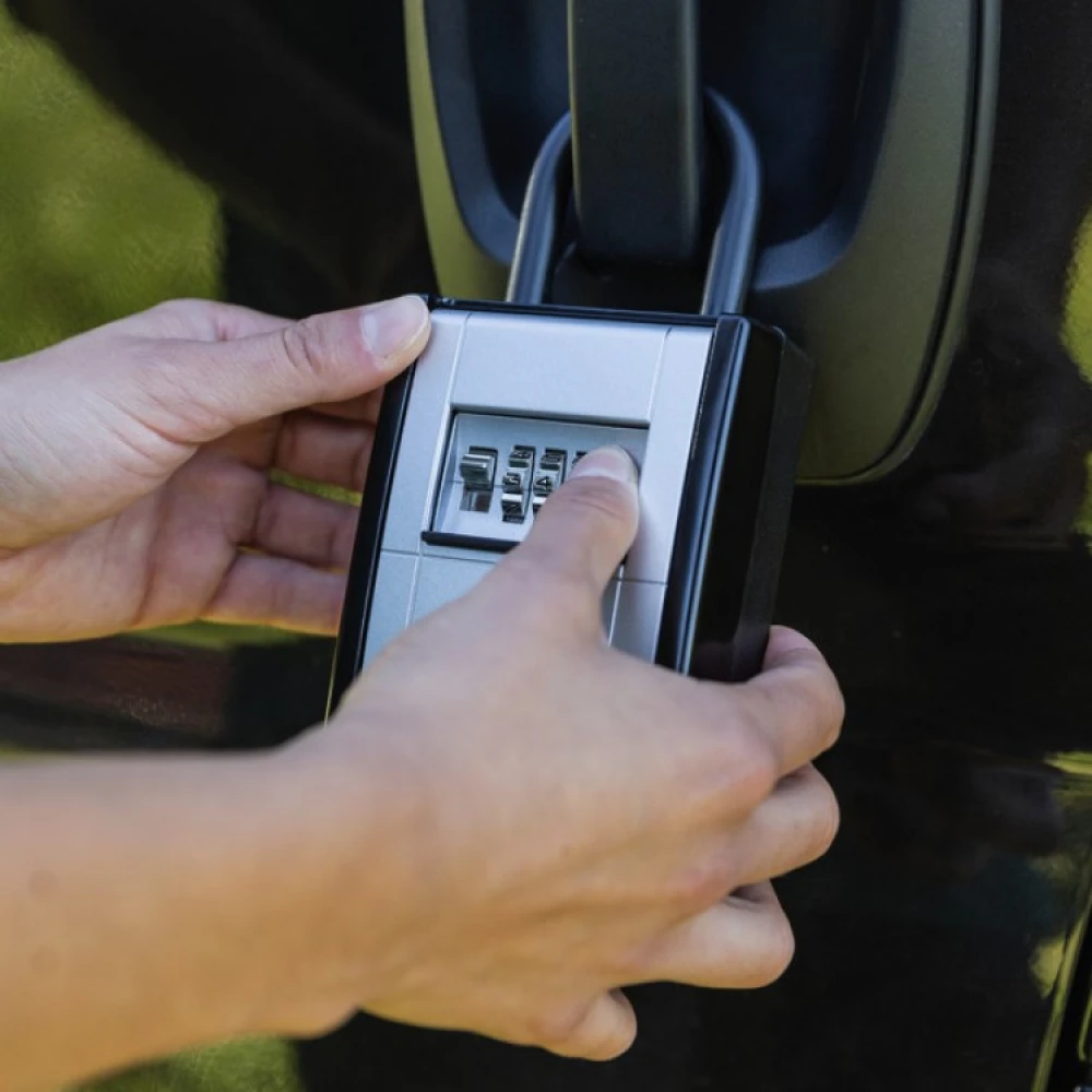 The key stash has a 4-digit code lock and a powerful shackle that allows you to lock the key stash at a good place. The 4-digit code lock is located behind a small safety hatch that you can easily open when you want to unlock the key stash.