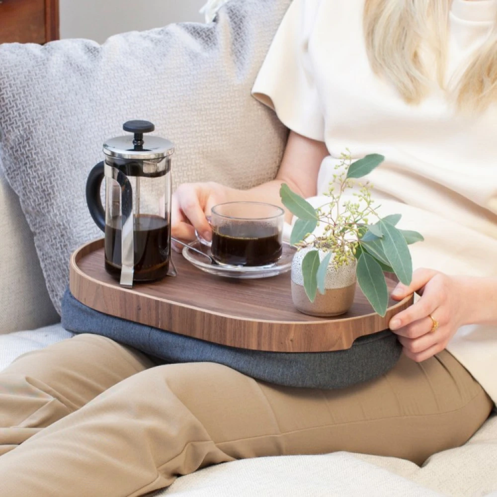 The knee tray has soft edge lines and is coated with a non-slip surface that prevents things from slipping when the tray is tilted. The fine wooden tray is made from exclusive walnut wood and each tray has its own unique colour and natural grain.