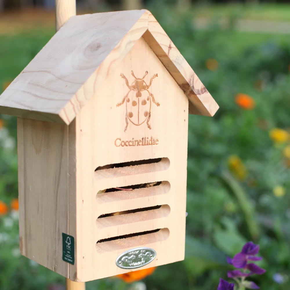 The Ladybug House is made from 100% FSC-labelled timber. The house opens on one side so you can take a look at the ladybugs even closer if you desire. Add some leaves, bark and dry grass to the inside so that they feel more at home with the natural elements. Ladybugs love to hide underneath leaves and between bark pieces to stay warm and protect themselves against the cold.