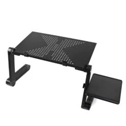 The laptop table holds a 15″ laptop and also has small ventilation holes that help your computer to cool down. You also have a small side shelf that you can attach to the side of the stand and use as a mouse mat. Perfect if you stand up to work.