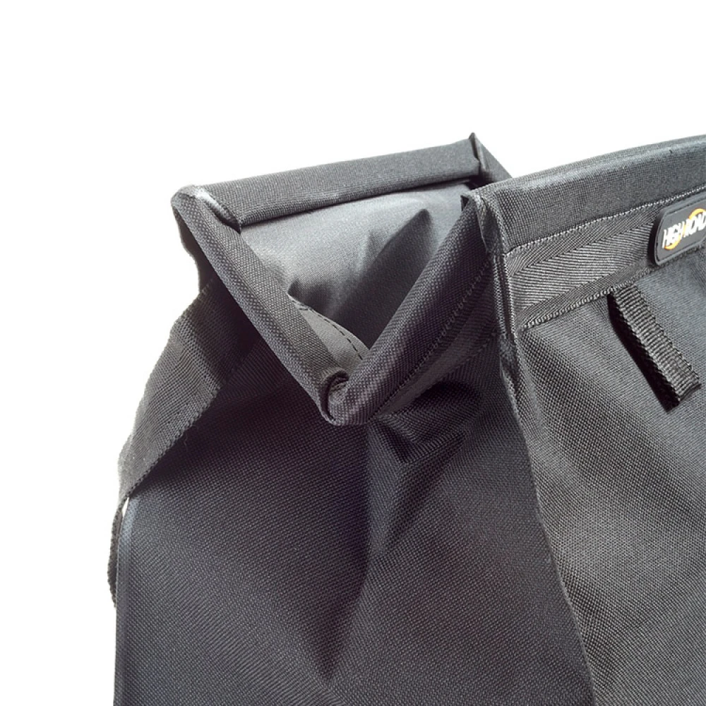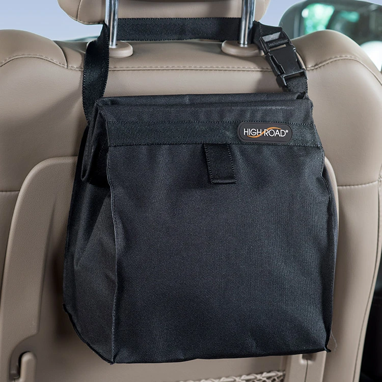 The bin is suspended around the headrest with an adjustable strap and buckle. The large opening can be locked in open or closed position.