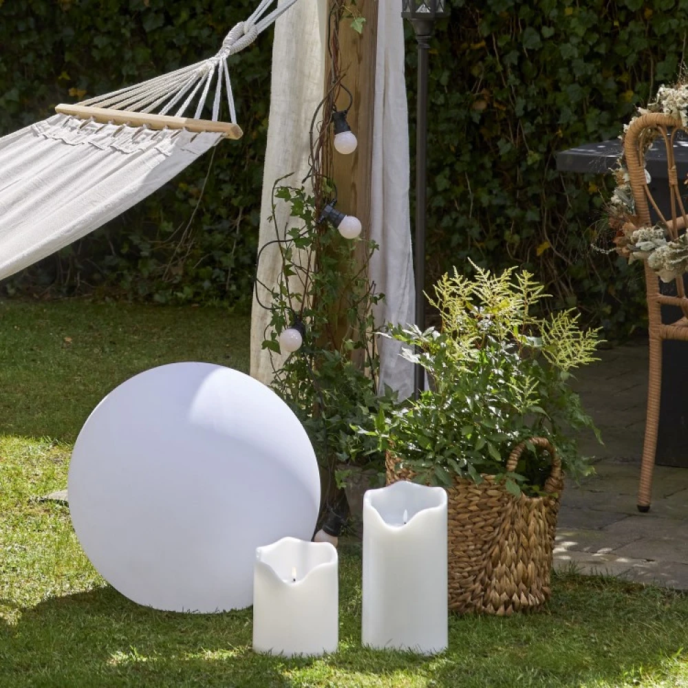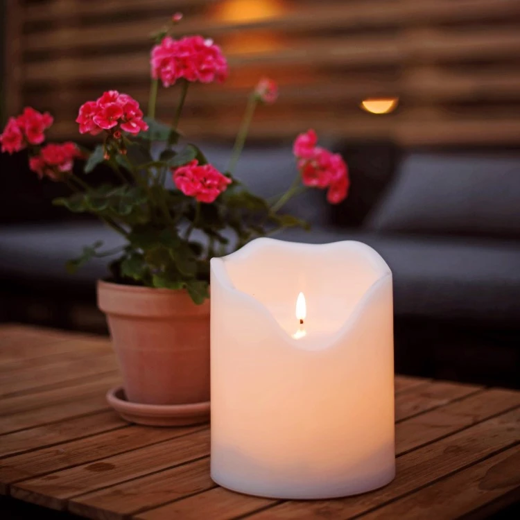 Large and sturdy block candle with warm white light that you can use outdoors on the patio, balcony or in the garden. The wide block candle has a nice, realistic flame that shines with a flickering flame. There is also another LED lamp inside the block light that shines through its walls with a steady light.