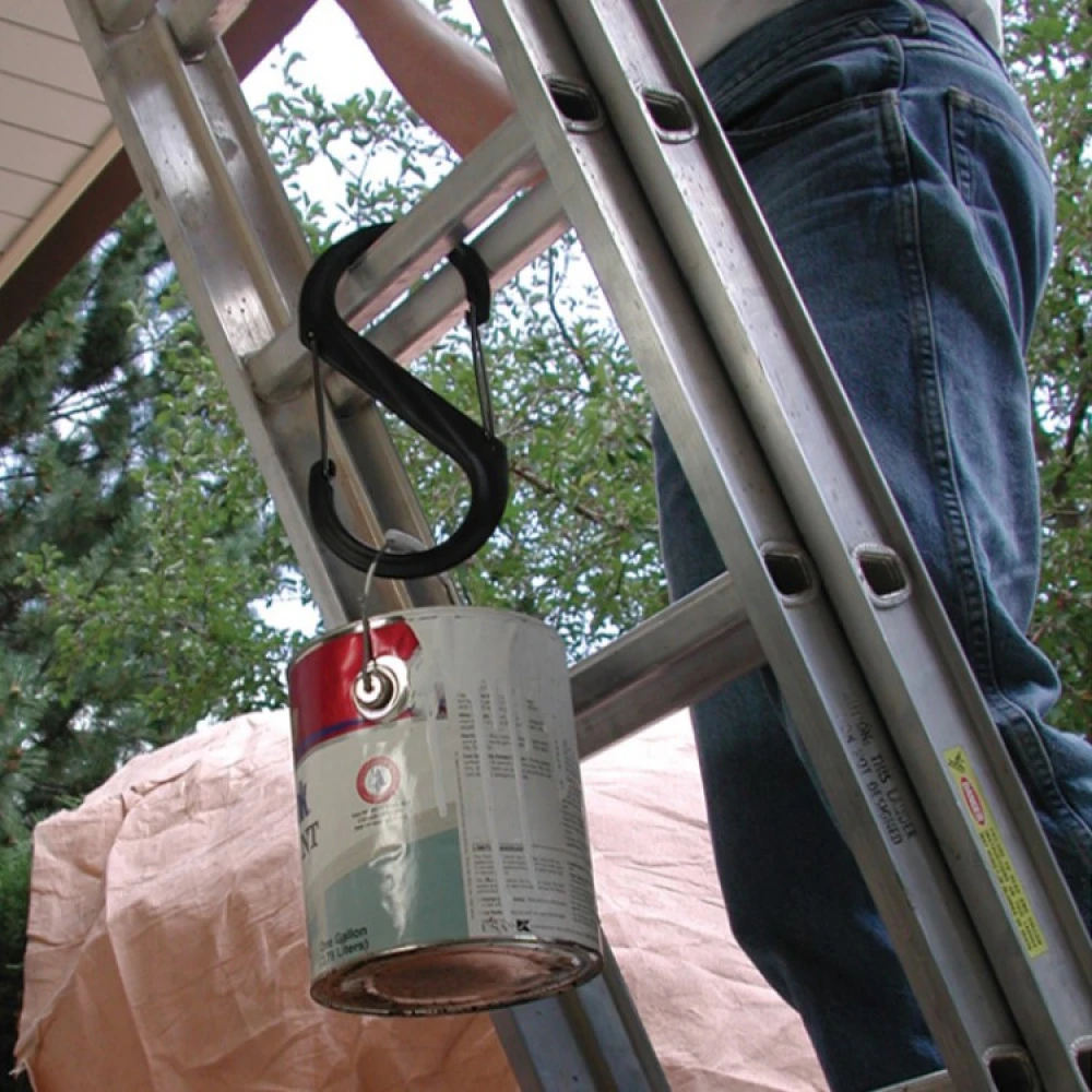 The carabiner can also be used as a handle to carry awkward items that don’t have proper handles. And if you need a larger portable hook, you can, for example, use the carabiner to hang a can of paint on the ladder.