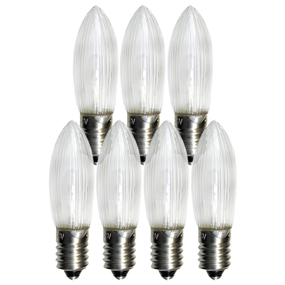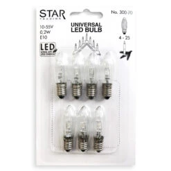 The LED-lights have an E10 socket and fit both candle holders and Christmas trees with a matching socket. Energy-saving and have 10000 hours burning-time.
