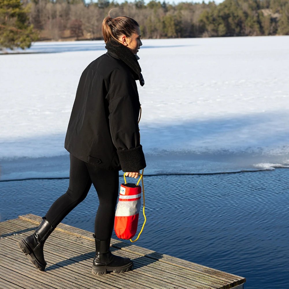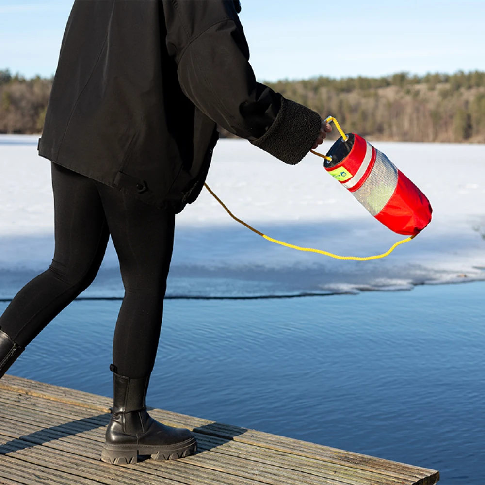 The lifeline is 15 metres long and weighs a mere 0.5 kg. The light weight ensures that most people are able to throw the line a good distance and also makes it easier to aim at the afflicted person in the water.