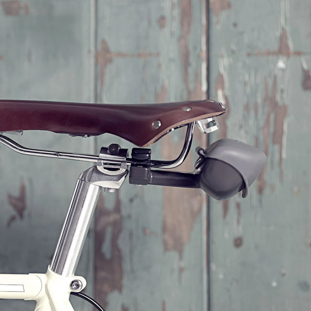 With this clever helmet cover, you can lock your helmet to your bike and protect the saddle from rain at the same time. When not in use, the helmet cover is rolled up and stored in a small box behind the saddle. This means that you’ll always have the cover handy and can quickly unroll it when you park your bike.