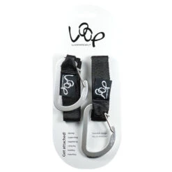 The durable fastening strap is easy to attach around many different items and has an aluminium carabiner that can hold up to 30 kg. You attach the LOOP by threading the strap through itself. Thread the end with the smaller loop through the larger loop at the back end of the strap. Then hook the carabiner into the smaller loop and the hook is now ready to use.