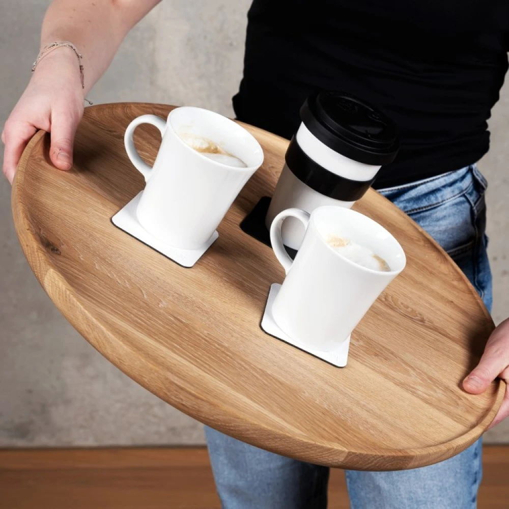 The magnetic coaster has self-adhesive nanomaterial on the underside that attaches to virtually any surface. It’s easy to remove and reposition and leaves behind no residue. If the nanomaterial gets dusty of dirty, you can rinse off the underside to restore adhesion.