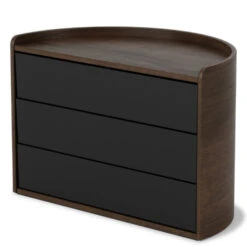 The storage box has a modern design and is made of wood. The shelves are made of durable plastic.